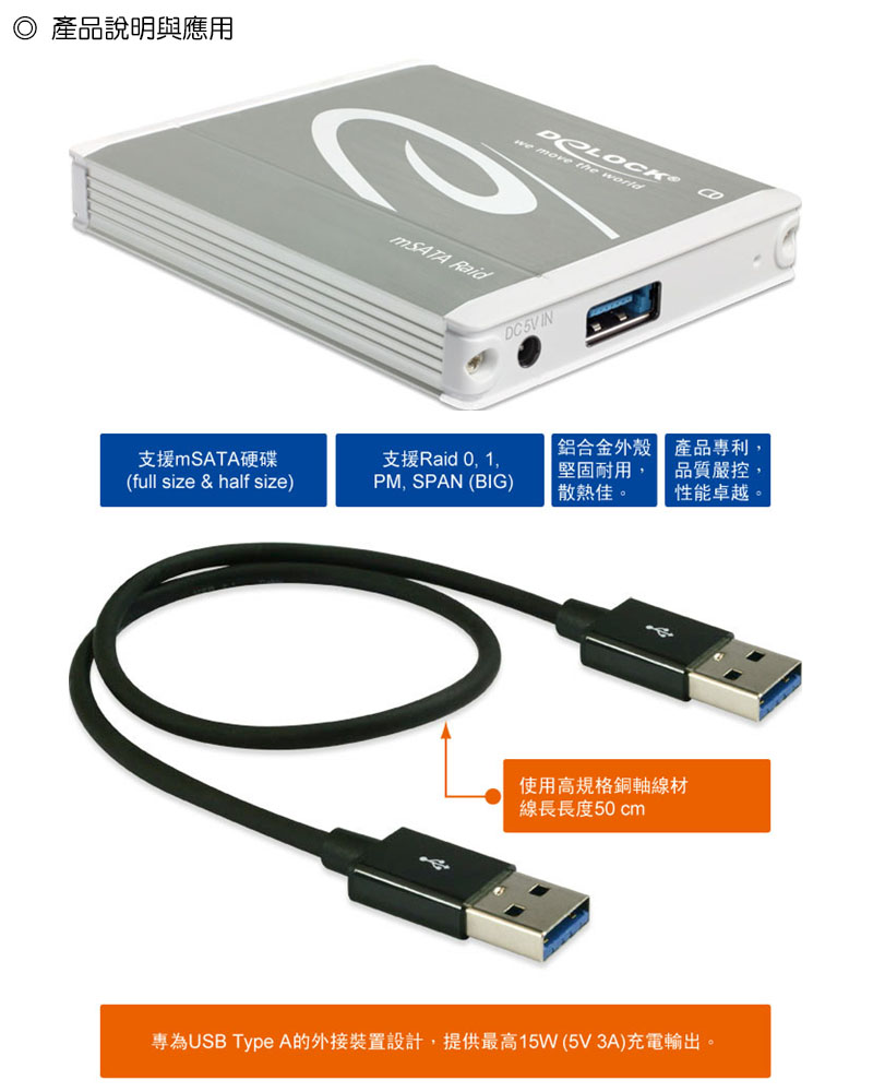 附件中所提供的 " USB 3.1 Gen 2 Type A to Type A公頭連接埠線材x1 " 此線材專為USB Type A female Device 設計的專業高規格銅軸線材。廣泛應用於相關產品含有USB Type A female 裝置中。是您必備的"電源資料傳輸線"之一。Delock 所生產的硬碟外接盒皆適用。