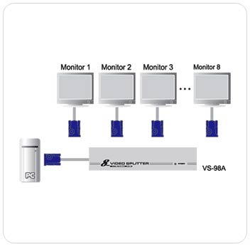 VS98A視訊分享器不僅可以將VGA、XGA、SVGA、UXGA或multisync monitor視訊訊號複製至8組輸出設備,並可強化視訊訊號以延長傳輸距離達65公尺。透過堆疊串接可分別支援多達512台顯示設備及提供頻寬高達300MHz。VS98A適用於加強與廣播視訊資料至公眾環境、由安全的地點監控工作環境、或針對企業或教室內的教育訓練提供高品質視訊畫面。