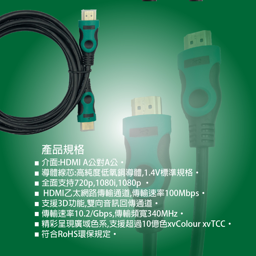 商品說明: ◆支援即插即用.高速度的傳輸能力.確保音質暢快傳輸 ◆高度耐氧化性和耐腐蝕性 ◆高密度編織網隔絕干擾+無毒環保PVC成型 ◆可通過高清晰度3D多媒體介面 ◆支援熱插拔 ◆可同時傳輸2組1080P及提供最高品質的數位視訊 ◆3D系統輸出輸入標準化 ◆支援1920*1080 24Hz級別的超高清圖像傳輸 ◆適用於HDMI相容產品,液晶電視機.機上盒.DVD播放器.投影機 ◆電腦.數位相機.智慧型手機.平板 ◆精彩呈現.廣域色系.支援超過10億色/xvColor/xvTCC ◆適用於客廳.辦公室.臥室.會議室.娛樂設備
