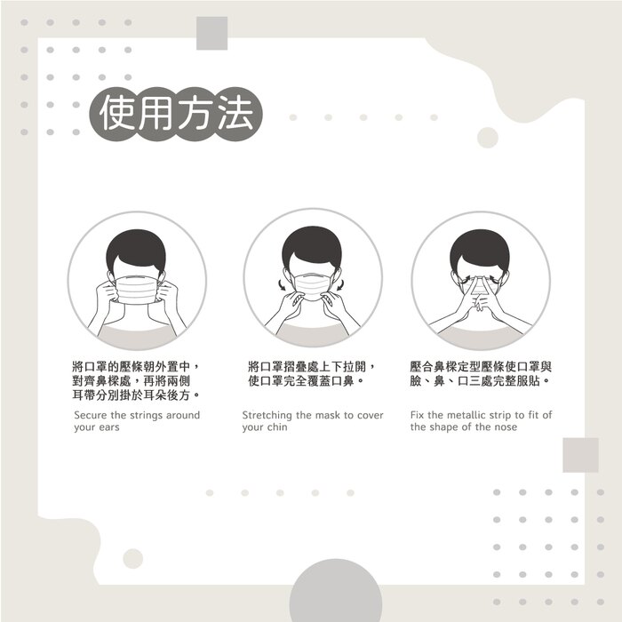 使用方式 :1.將口罩壓條朝外置中,對齊鼻樑處,將兩側耳帶掛於耳後。